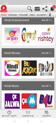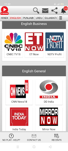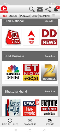 Các kênh truyền hình trực tiếp của Hindi News News;AAJ TAK, ABP Ấn Độ, Bharat Samachar, DD Kisan, DD News, GNT, Hindi Khabar, India TV, Janta TV, Jan-Tantra TV, K News India, Khabar Fast, Khabrein Abhi Tak, Times Navbharat, NDTV Indiat 24, Tin tức Ấn Độ 24x7, News Nation, News18 Ấn Độ, Prime News, Cộng hòa Bharat, Sadhna Plus, Sansad TV, Sudarshan News, Swaraj Express, TV9 Bharatvarsh, TV 100, Zee Hindustan, Zee News. Kênh truyền hình trực tiếp;Kashish News, News18 BR_JH, Samachar Plus, Zee BR_J.Ấn Độ Tin tức nhân sự, Zee Delhi NCR_HR.Bansal News, IBC 24, Ind 24, India News MP_CG, INS News, News18 MP_CG, TV 24, ZEE MP_CG.Ấn Độ đầu tiên, Sach Bedhadak, Ấn Độ News Raj, News18 Raj, Zee Raj.ABP Ganga, Ấn Độ News UP_UK, News State UP_UK, News18 UP_UK, Zee UP_UK.CNBC AWAAZ, ET hiện Swadesh, Zee Business.