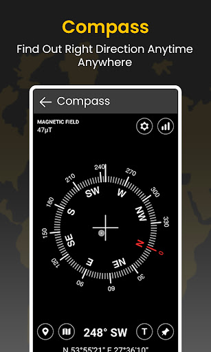 Compass to see direction allows you to see the direction of your body or device anywhere with angle information.
