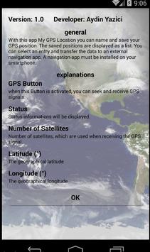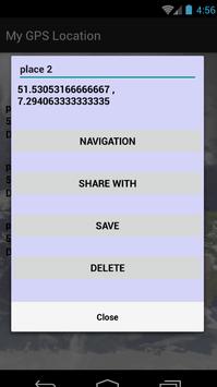 With the app "My GPS Location" You can name and save your GPS position. The saved positions are displayed as a list. There you can select an entry and transfer the data to an external navigation app when a navigation app installed on your smartphone. You can also share the current location with your friends.