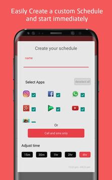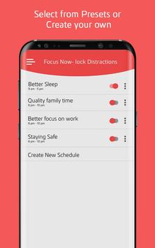 Focus Now Locks any App on your mobile for a specific time period which you can set manually and locks away any distractions during that specified time period. You can also set the day on which you want to activate it.