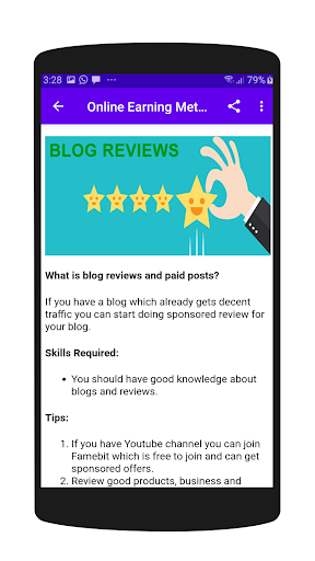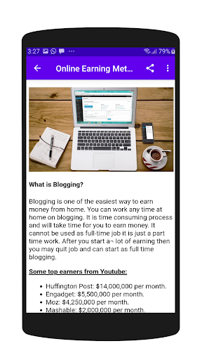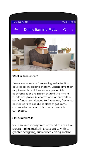 Different methods of earning online money are defined in this app. We will guide you as how to earn money online. Freelancing is good to earn beside your job or business. It can give you smaller to handsome amount of money. It is important to know for everyone as methods of online earning money. There are many freelancing jobs awaiting for you to work on and to make money online. Different type of jobs also available online as like freelance graphic designer, freelance programmer, freelance marketing jobs and many more.