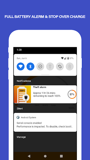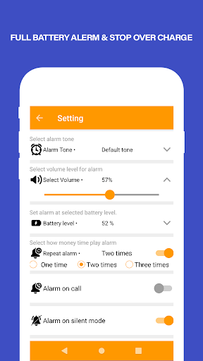 Full battery charge alarm which notify phone user with help of battery fully charged notification and stop unnecessary charging.