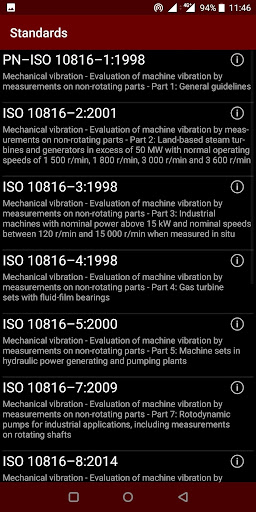 Built-in analysis wizard using the criteria for assessing the technical condition of machines specified in selected standards. The analysis parameters and technical qualification thresholds are selected automatically based on the basic information about the machine required by each standard. If you have not found the standard you are interested in, please let us know. The application uses a small part of the information contained in the standards. Before starting the tests, read the full text of the chosen standard thoroughly.