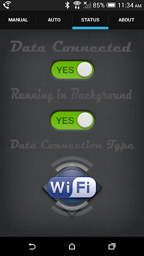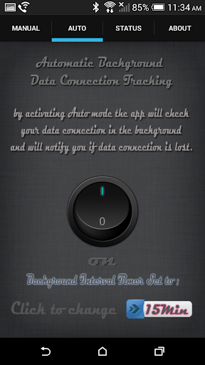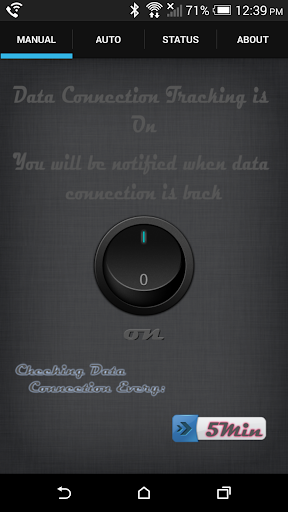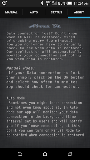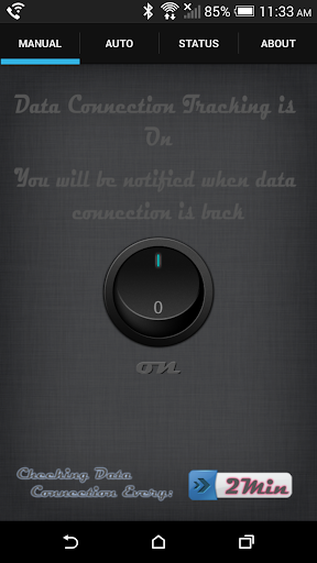 Once you notice your data wifi 4g 3g 2g connection is lost, simply turn on the Manual mode data tracking button and select the time interval you want the app to check for your connection. Once our app notices that your data wifi 4g 3g 2g is back you will be notified, so no longer do you have to keep checking.