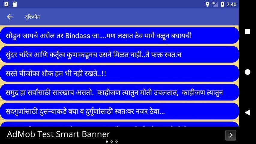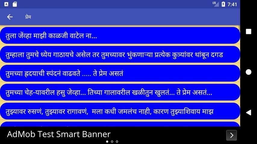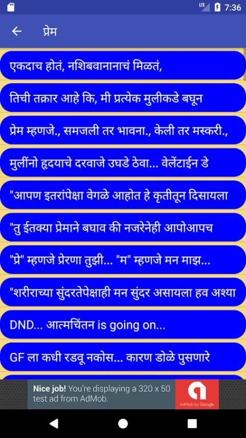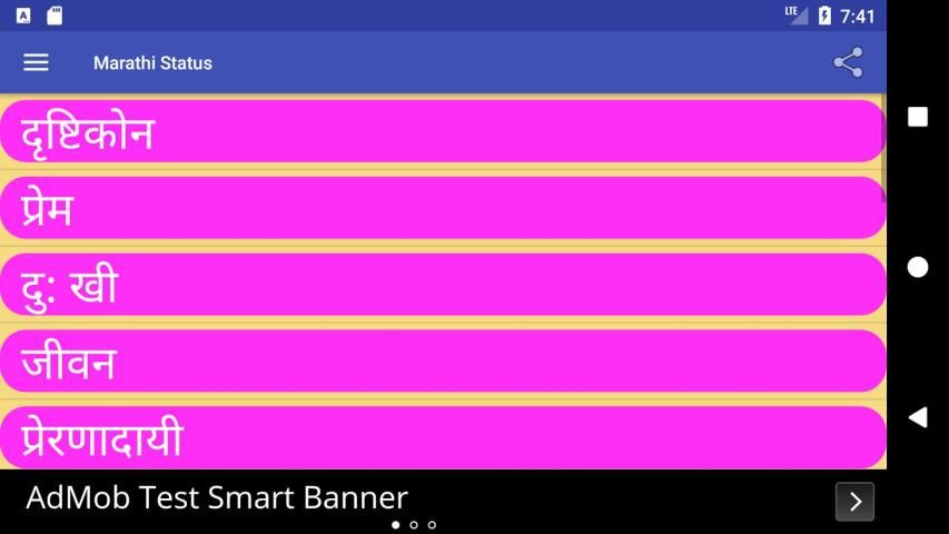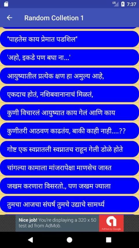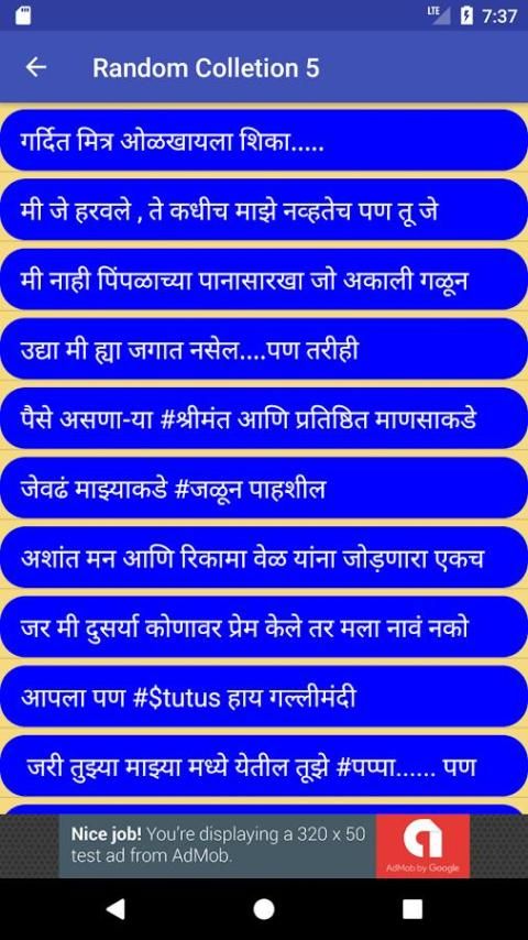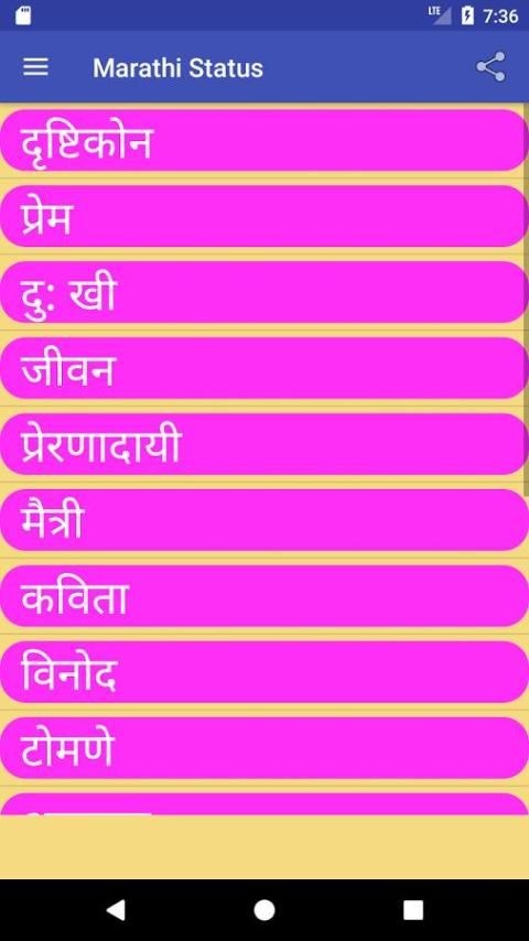 This app Marathi Status (मराठी स्टेटस) contains Marathi Language Status Messages for Social Media Apps with 17 different categories .