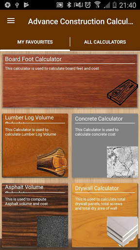 This app includes all calculators including all the calculator for constructions. The application includes the following calculators with interactive interface.