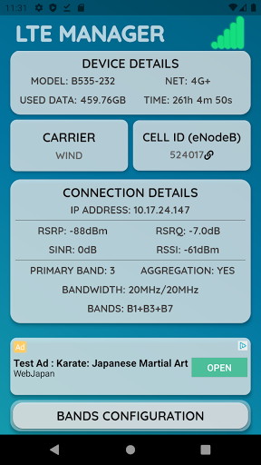 Es posible controlar los valores relacionados con su conexión al BTS ( Base de la estación de transceptor, la intensidad de la señal, mantenga la velocidad real (e instantánea) bajo el control de la conexión a Internet y mejor configure las bandas (LTE).