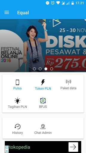 Equal adalah penyedia jasa Pembayaran ( micro Payment ) yang memberikan kemudahan transaksi BAYAR - BAYAR untuk kalangan pembisnis yang memiliki kendala yaitu MODAL, ini sangat mempermudah pemilik warung kelontong, mahasiswa ataupun pelajar yang ingin memulai berjualan tanpa modal. Dengan aplikasi ini pembisnis akan membayarkan modal yang telah terpakai setelah satu minggu ( Jatuh tempo ).pembayaran dapat dilakukan melaluin alfamart