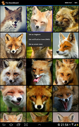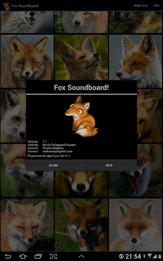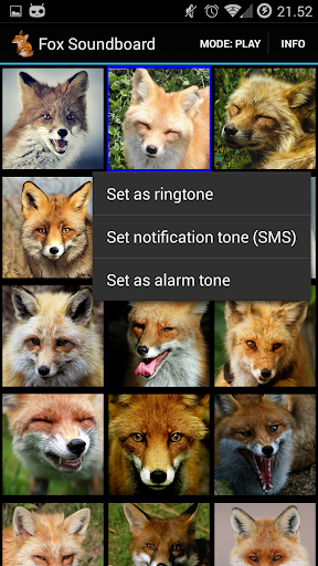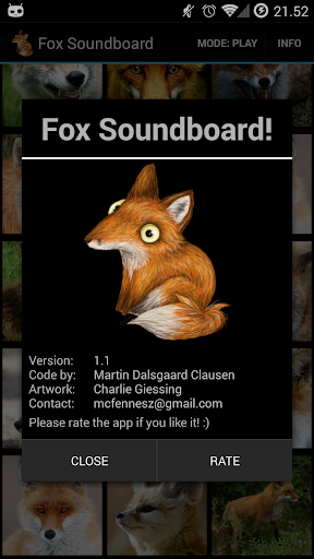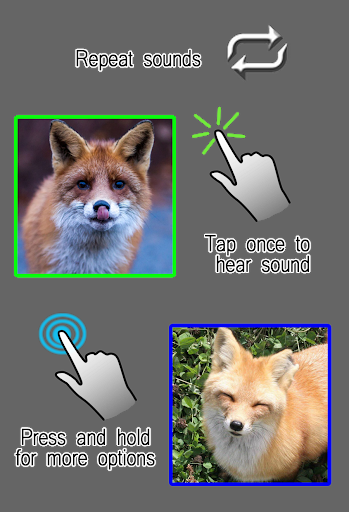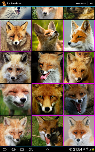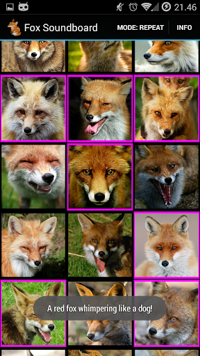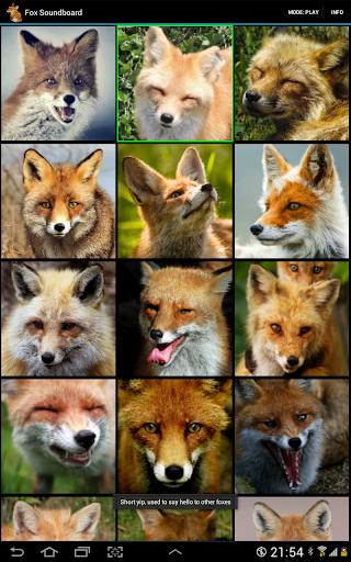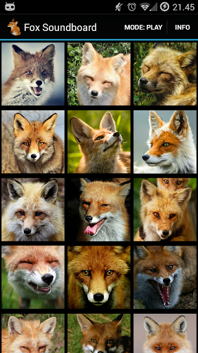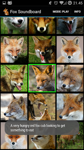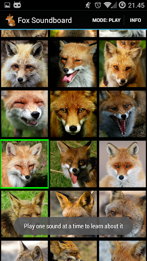 Fox Soundboard has more than 20 different high quality sounds from foxes allover the world. Learn about the different cry's of foxes, from the common red fox to the arctic fox and fennec fox. Play a sound, and read the description on screen! Play one sound at a time, or start a whole foxy choir. Change your alarm tone, your ringtone, or your notification tone. Watch beautiful pictures of the different species while you listen, and hear the fox's mating call, warning cry, and many other social calls for free.