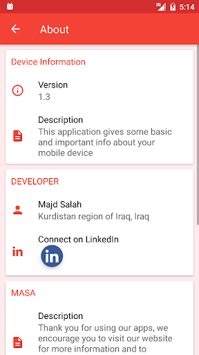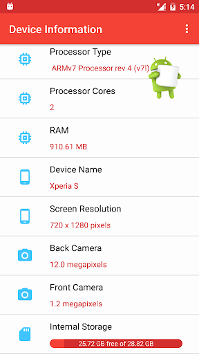 Know information about your mobile hardware as - Android Version Number & Name - Screen Resolution - Camera front & back megapixels - RAM size - Internal and external storage sizes - CPU speed, cores, type