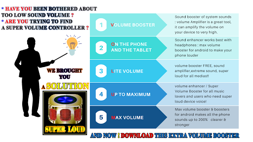 Super Volume Booster - Sound Booster Making the all sounds of your device much louder. Useful for movies, audio books and music; Increase all system volume including ringtone volume, notification volume and alarm volume. Super Volume Booster is able to push the phone volume up higher than the system defaults; Making the all sounds of your device much louder. this Super Loud phone volume booster Speakers offers direct access to Android Media Player with one click, you can make any program as loud as you want; Now with extra volume booster - ultra sound booster, you are not limited by the maximum amplification capabilities of your Android sound. Super loud sound speaker 3d & Free volume booster is an excellent booster volume control app that controls the volume, speakers and volume bluetooth of the android phone for all sound streams.