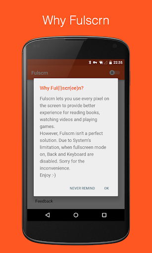 However, Fulscrn isn't a perfect solution. Due to System's limitation, when fullscreen mode on, Back and Keyboard are disabled. Sorry for the inconvenience.
