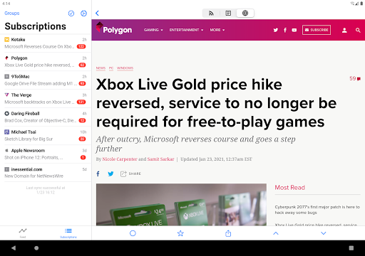 * A dedicated subscriptions tab organized by latest updates with article titles.