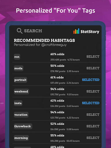 Get up to 4x more impressions on your posts with relevant, targeted, fresh, hashtags created in real-time just for you. Hot insta posts don’t just happen - they require tools. Statstory will help you get those likes, views, and followers.