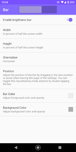 Further settings include automatically adding the bar when rebooting the device, adding an indicator showing the current display brightness and styling the look of the indicator.