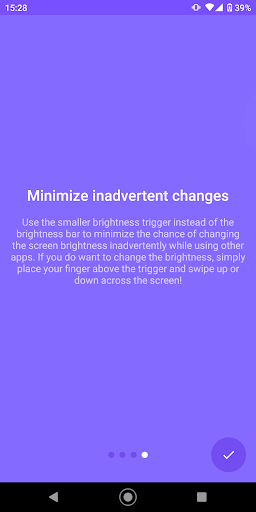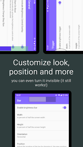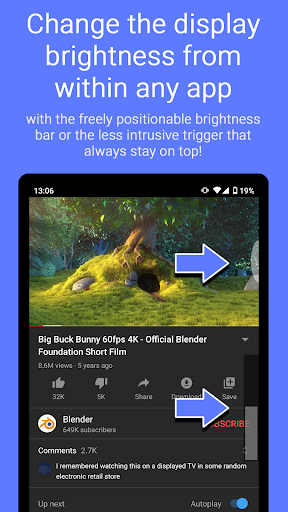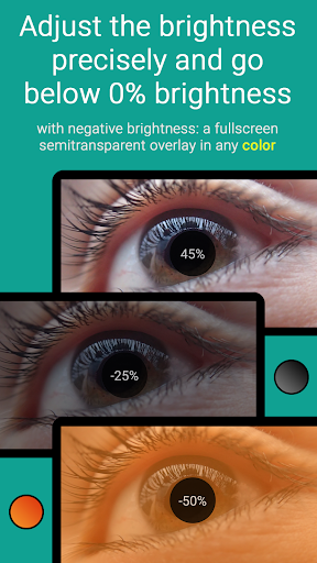 Floating Brightness Control adds a brightness level bar overlay to your screen that is always on top of other apps. This allows you to change the display brightness instantly without interrupting what you are doing, like watching a movie or playing a fullscreen game. If the bar is too big for your taste, try the brightness trigger instead - a smaller configurable "tap target" that allows you to use the screen space above and below as slider for the brightness level!
