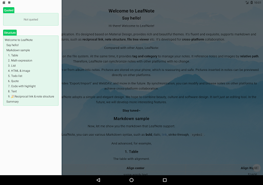 Leaf Note is a private Markdown and note-taking application for multi-platform collaboration via cloud sync. Leaf Note is designed based on Material Design with powerful functions.