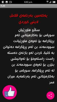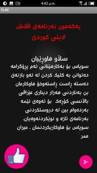 هیوادرام به‌كارهێنه‌ری زۆربێت چونكه‌ به‌رنامه‌كه‌ كوردیه‌ دیزاینێکی جوانم بۆکردووە.. هیوادارم واز له‌ بەر‌نامه‌ی گه‌لی بێگانه‌ بێنین و به‌رنامه‌ی فلاشی كوردی به‌كار بێنن چونكه‌ من بۆ ئێوه‌ی خۆشه‌ویستم ئاماده‌كردوه‌ خۆم هیلاك كردووه‌ هیوادارم به‌كارهێنه‌رێكی زۆر له‌خۆی كۆبكاته‌وه‌ چاوه‌ڕێی به‌رنامه‌ی نوێ بن ... سوپاس بۆ ئه‌وانی به‌كاری دێنن و باوه‌ڕیان به‌ به‌رنامه‌ی كوردی هه‌یه‌ی و باوه‌ڕێان به‌ پێشكه‌وتنی كورد هه‌یه‌ ..