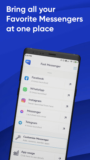 Fast Messenger App also shows your usage statistics of your favorite messengers. Now you don't have to search for your social chat applications. Launch your social apps with this messenger easily and you can access all your social media accounts with a single click.