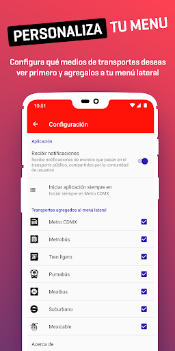 Keep a list of your favorite Metro stations, Metrobus, Light Rail, Mexibus, Mexicable, Suburban and configure the types of public transport you want to see, you can set up the public transport to start the app and set up your side menu, customize your menu the transport you use the most
