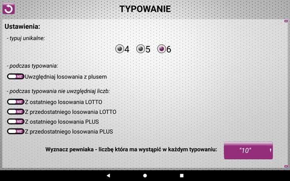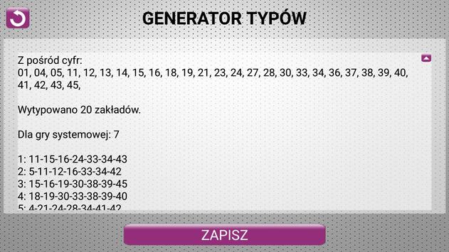 Zaawansowany program do generowania typów do gry losowej LOTTO oraz LOTTO PLUS. Użytkownik sam może zdecydować czy z jakich cyfr ile i dla jakiego systemu (6-12) aplikacja ma wygenerować typy. Może on również zadecydować czy typy mają zawierać unikalne 6, składać się z unikalnych (które nigdy nie padły) piątek czy nawet czwórek. Decyduje również czy generowane typy ma uwzględniać unikalne kombinacje również z lotto plus,