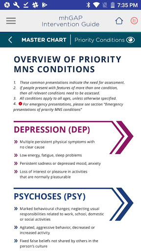 mhGAP-IG 2.0 App (e-mhGAP) is the official e-version of the World Health Organization’s mhGAP-Intervention Guide for mental, neurological and substance use disorders in non-specialized health settings Version 2.0. The mhGAP-IG 2.0 App is a valuable tool to scale up services for people with MNS conditions and their families.