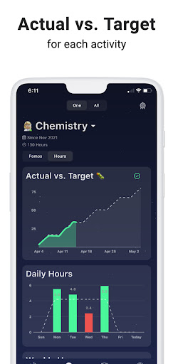 With Milki, you can set variable daily study targets for each activity and track against them over a defined period e.g. 2 weeks or 2 months. The Actual vs. Target (worm) chart is incredibly powerful at keeping you on track with your goals, you can visually track your performance over the period. No other study timer app does this, so I had to create one that did haha.