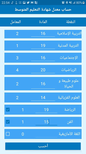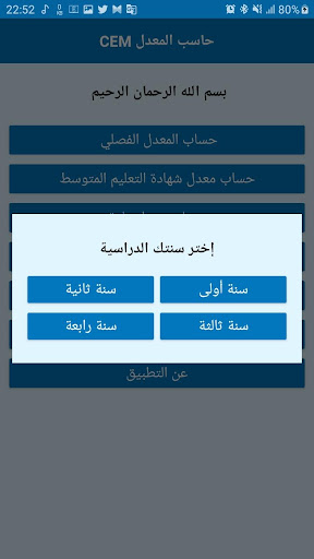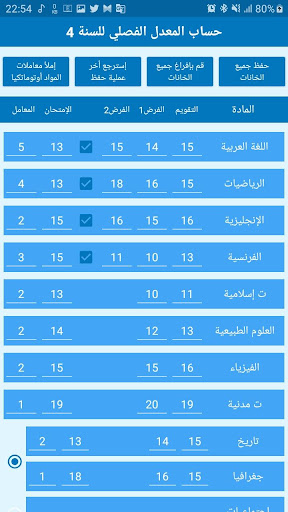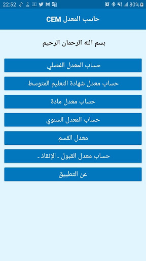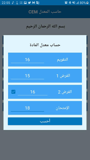 the حاسب المعدل CEM app is an android application that helps the Algerian middle school students or their parents or teachers to calculate many types of averages like they calculate it in the Algerian middle schools, for example it helps to calculate the :