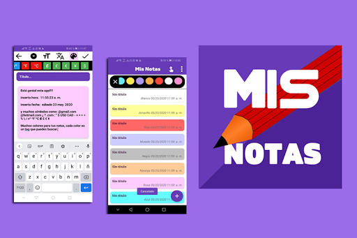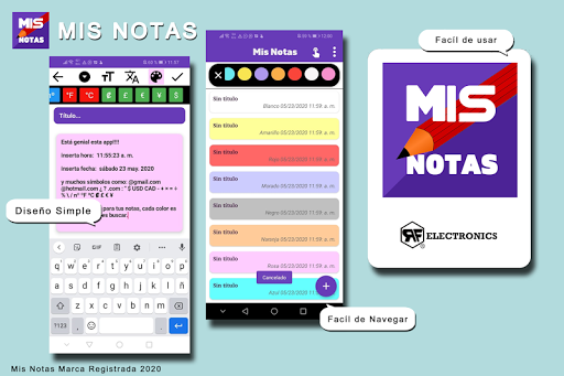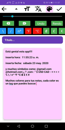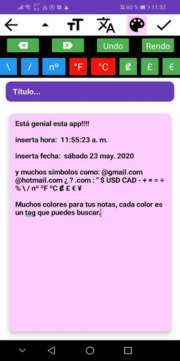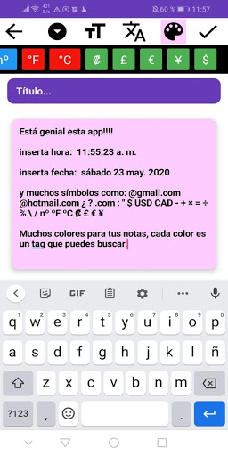 los símbolos difíciles de encontrar más utilizados. Insertar la fecha u hora actual con un solo botón. Botones de borrado hacia adelante y hacia atrás. Tags de colores. Cambia el tamaño del texto. Comparte tu nota como imagen png. Envía múltiples notas a tus amigos fácilmente. Las notas se guardan en orden de creación, siempre encontraras tu nota en el mismo lugar. Encontraras rapidamente tus notas como nunca antes.
