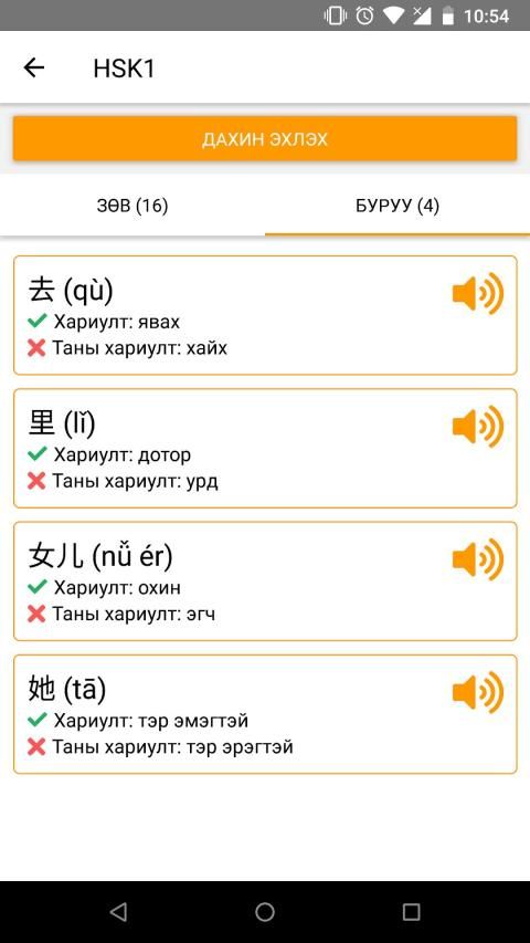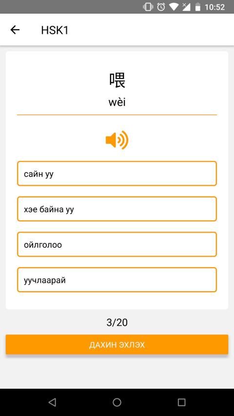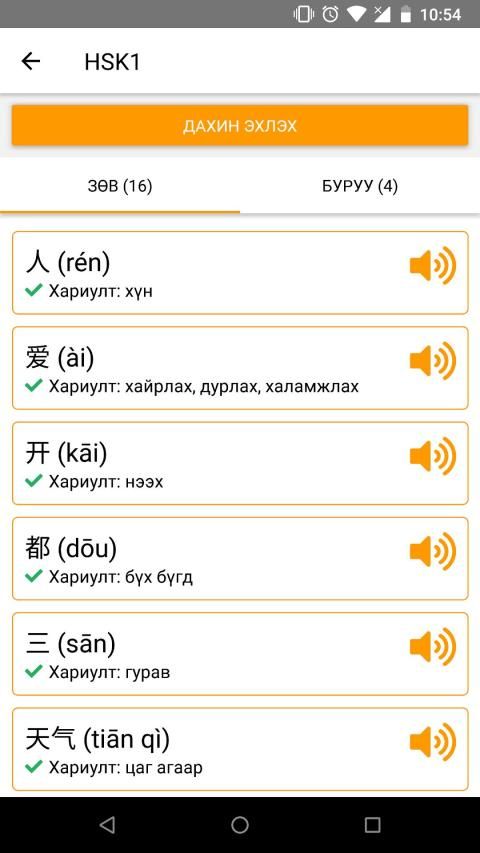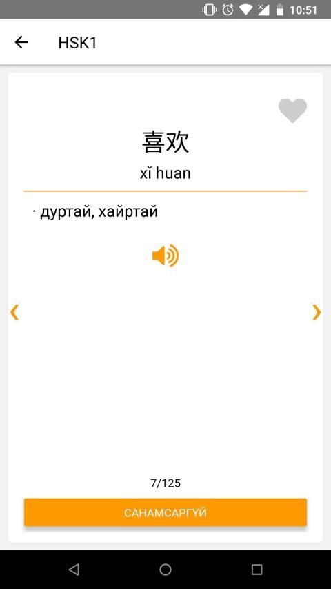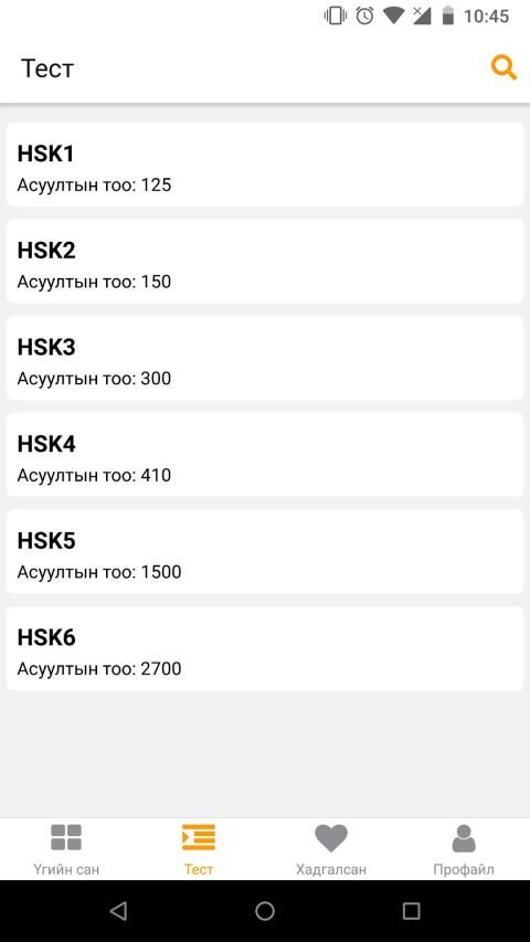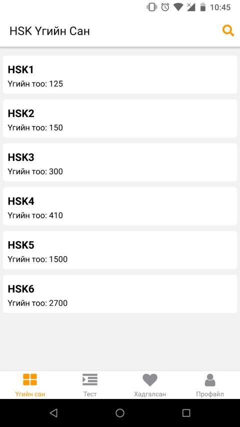 HSK is a Chinese language proficiency test. There are 6 levels in total, with 1st and 2nd grades representing Basic knowledge, 3rd and 4th grades representing Intermediate knowledge, and 5th and 6th grades representing Advanced knowledge. The "HSK Vocabulary" app is designed for Chinese language learners to easily translate and memorize kanji for each level in Mongolian, and we allow you to test your knowledge of each level of vocabulary. The test requires knowledge of a certain number of kanji suitable for each level.
