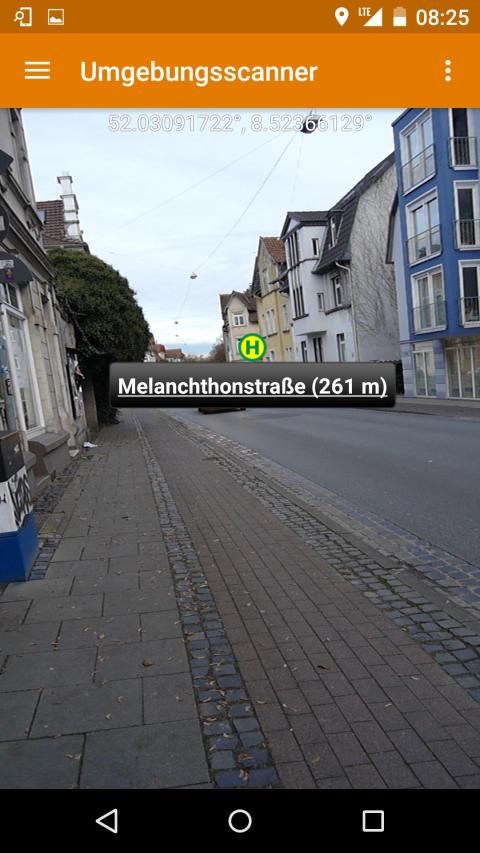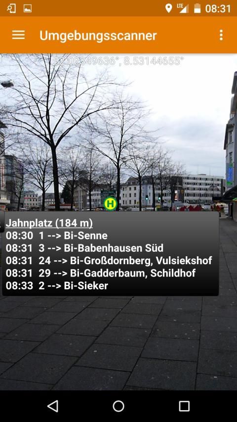 Umgebungsscanner: Hier wird die Kamera Ihres Smartphones aktiviert. Der Scanner zeigt Ihnen auf dem Bildschirm Ihre Umgebung an und blendet Haltestellen ein, wenn die Kamera in die Richtung einer Haltestelle gerichtet ist. Sie können den Namen der Haltestelle sowie die Entfernung sehen. Beim Anklicken der Haltestelle öffnen sich die nächsten Abfahrtszeiten.