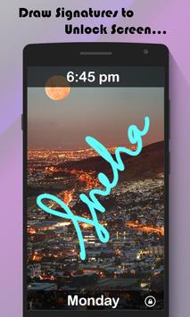 The lock screen detects and matches every time the signature drawn on the lock screen with your signature created and saved by you as your lock screen password. You can draw and save any thing like symbol of star, heart, triangle, square, circle etc, or you can draw any numerical number or make a signature of your as your password.