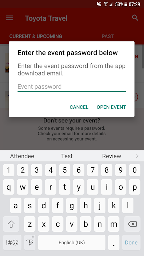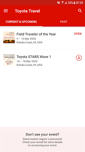 The Toyota Travel app supports Toyota Motor North America events. Only invited attendees may access the application, which will serve as a mobile resource for the event. The app includes a schedule of events, list of attendees, maps, and other important information.