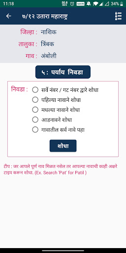 • Find your Satbara 7/12 Utara Maharashtra with help of survey number / GAT number, first name, middle name or last name./ ७/१२ उतारा शोधा सर्वे नंबर / गट नंबर, पहिले नाव, मधील नाव, आडनावाद्वारे शोधणे
