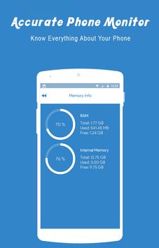 and make the info listed together in app for you to have a quick overview of your device’s property, such as size of phone storage, ram space ,network information Android system version, CPU info, battery temperature, etc.