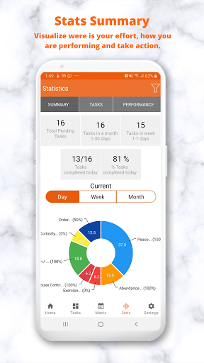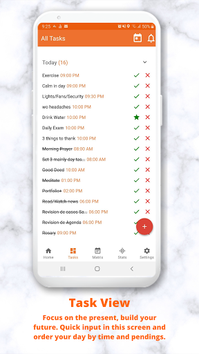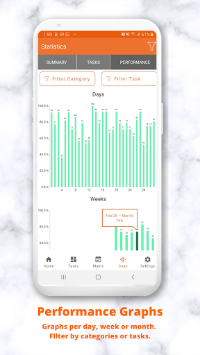 One of our greatest contributions is to offer you a complete and dynamic performance presentation. It will include a variety of statistics that you can sort by view, task recurrence, category, time, date, A-Z and percentage execution. A real and complete visibility of what you do and have done, will give you a picture of the accomplishment per categories, subcategories and specific tasks. In other words, you will measure every single input and be able to take control.
