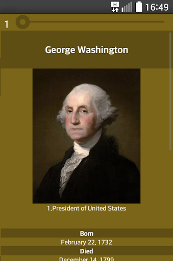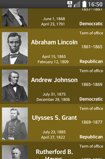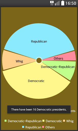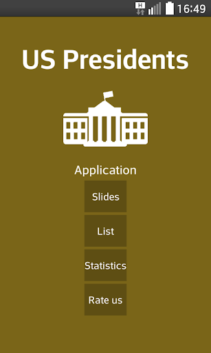Application US Presidents allows you to learn about every US president. It contains information about dates, states, vice-presidents and basic information about decision during ruling time and short description. Application uses charts to show statistics about parties and states. US presidents app allowsto show presidents in two ways by using list and slides.