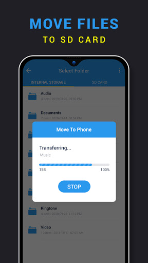 Get the all new and the most advanced Move To SD Card App which allows you to Move Files To SD Card as well as Move App To SD Card. Move your Photos, Videos, Musics, Zip Files, and all Other Downloads from your Phone Memory to SD card. You no longer have to worry about low Internal Memory.
