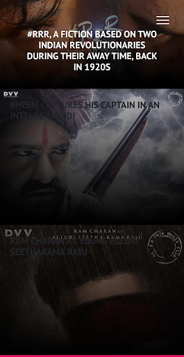 RRR is an upcoming Indian Telugu-language period action film[1] written and directed by S. S. Rajamouli. It stars N. T. Rama Rao Jr., Ram Charan, Alia Bhatt and Ajay Devgn.[3] It is a fictional story revolving around India's freedom fighters, Alluri Sitarama Raju and Komaram Bheem who fought against the British Raj and the Nizam of Hyderabad, respectively. The movie's story is a fictional retelling of their lives during their self-imposed exile.