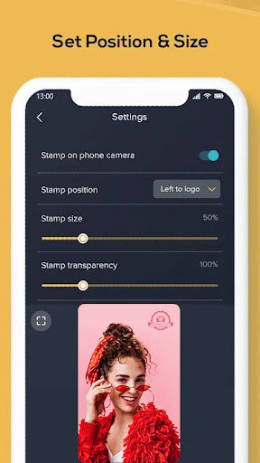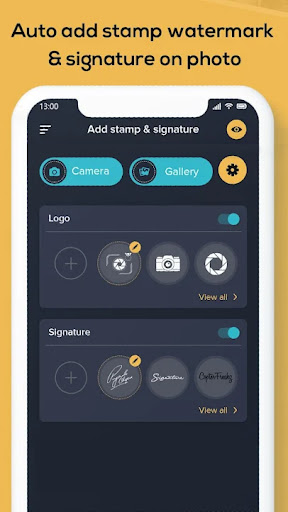 In this app, if you turn on Auto Logo Stamp option, then your logo or signature will be added automatically as you click a photo from your camera.