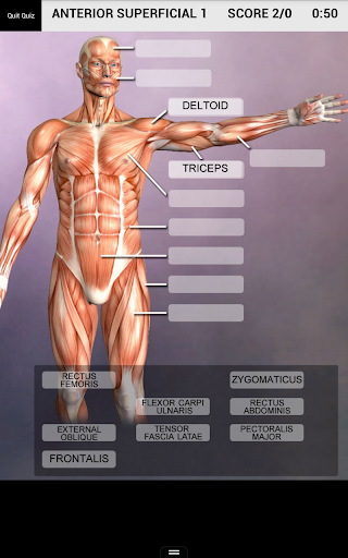 QUIZZES: 6 types of quizzes! 18 pages of label matching quizzes where you have to match a name to the correct location. Multiple choice quiz builder that allows you to test the name, action, origin or insertion for each muscle. Skeletal quiz tests your knowledge of each bone name. These two quizzes feature adaptive quizzing which adds your missed answers to the Favorites, allowing you to test yourself on only what you have missed (or create your own quiz on just what you want to learn). The Action quiz tests your knowledge of every joint action in the body. The Spelling quiz tests spelling of muscle and bone names. The general quiz tests your knowledge of general muscle and bone anatomy subjects. You can also email your scores to an instructor or friend.