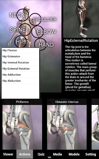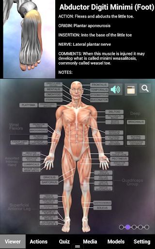 VIEWER: The viewer allows you to control a 3D view of the body, with labels that lead to full screen images of 145 muscles each with the name, action, origin, insertion, nerve supply and comments for each muscle. The viewer also includes all the bones with detailed landmarks.
