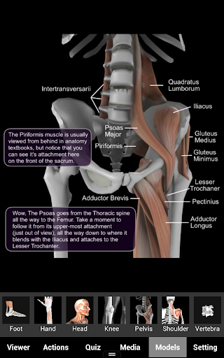 3D MODELS: There are seven 3D models, each model allows you to control a body area in 3-D space, with multiple stops along the way that identifying the structures and give comments on each area. Models cover the ankle, knee, pelvis, shoulder, face, hand, and a detailed look at the vertebrae.