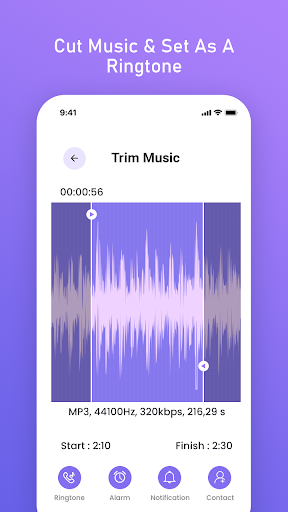 * Cutting editor. Crop or Trim music, cut audio. Optimize size of music, remove unwanted parts. Make smaller audio to set music as ringtone.