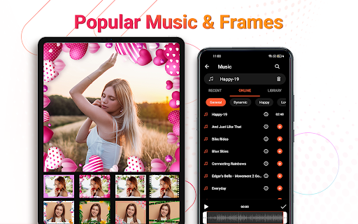 Photo Video Maker with music provides a lot of Frames, Effects, Music, and Transitions. All you need to do to make great videos is: Choose a photo, add music, set effects, time adjustments, save videos, and slideshows, and share them with friends.