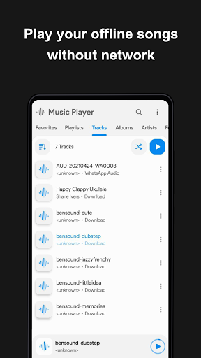 Music player can quickly show you tracks by artists, albums, genre, playlist, and the music folder structure. Access your music library directly from the app.