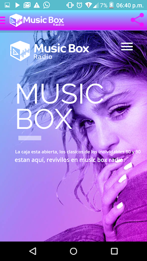 Music Box Radio: www.musicboxradio.com.ar, es la mejor forma de revivir los clásicos de los 80's, 90's, y 00's, con sonido de alta definición. La música que formó parte de tu vida, que marcó una época dorada vuelve a sonar en una App que te acompañará a todos lados. La caja está abierta, y suena más fuerte que nunca, descargá, poné play y subí el volumen, Music Box es un vuelo sin escalas a la mejor música del mundo, disfrutala. MBX Radio es un desarrollo de www.globalmd.com.ar, Santiago del Estero, Argentina.
