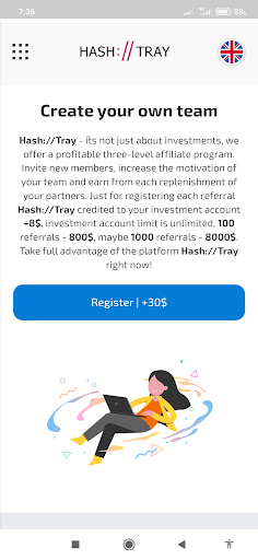 Company Hash://Tray provides a generous reward of 8$ for each registered person through a referral link, as well as deductions for a three-level affiliate program 7% / 3% / 1% from the amount of each replenishment of the balance by the referral.