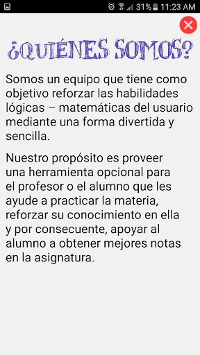El objetivo del proyecto es reforzar las competencias disciplinares básicas de la asignatura de matemáticas, asimismo mejorar el cálculo mental de acuerdo con los planes de educación en el nivel secundaria de esta asignatura y, en consecuencia, mejorar su calidad y comprensión de la materia para su actividad académica y en la vida diaria. Se tiene planeado de manera general proveer una herramienta virtual de carácter lúdica a las personas, en específico a estudiantes de secundaria que se encuentran en 3er año y a jóvenes que cursan de primer a cuarto semestre de bachillerato que requieren o desean practicar y reforzar sus habilidades lógicas - matemáticas.