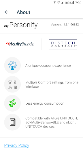 app that allows you to easily customize your comfort settings directly from your mobile device when connected to a suitable room device (Allure UNITOUCH, EC-Multi-Sensor-BLE, nLight UNITOUCH) designed by Distech Controls (an Acuity Brands company).